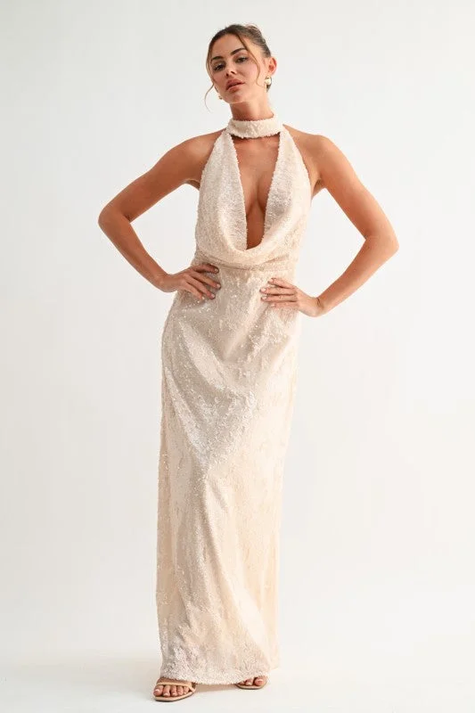 This Halter Dress Is Crafted With Sequin Detailing Throughout, Offering A Radiant, Light-Catching Finish. Designed With A Plunging Draped Neckline And An Open Back, The Silhouette Flows Into A Sleek Floor-Length Hemline. The Dress Fastens With A Concealed Back Zipper And Button Closures At The Halter Neck For Secure Wear.